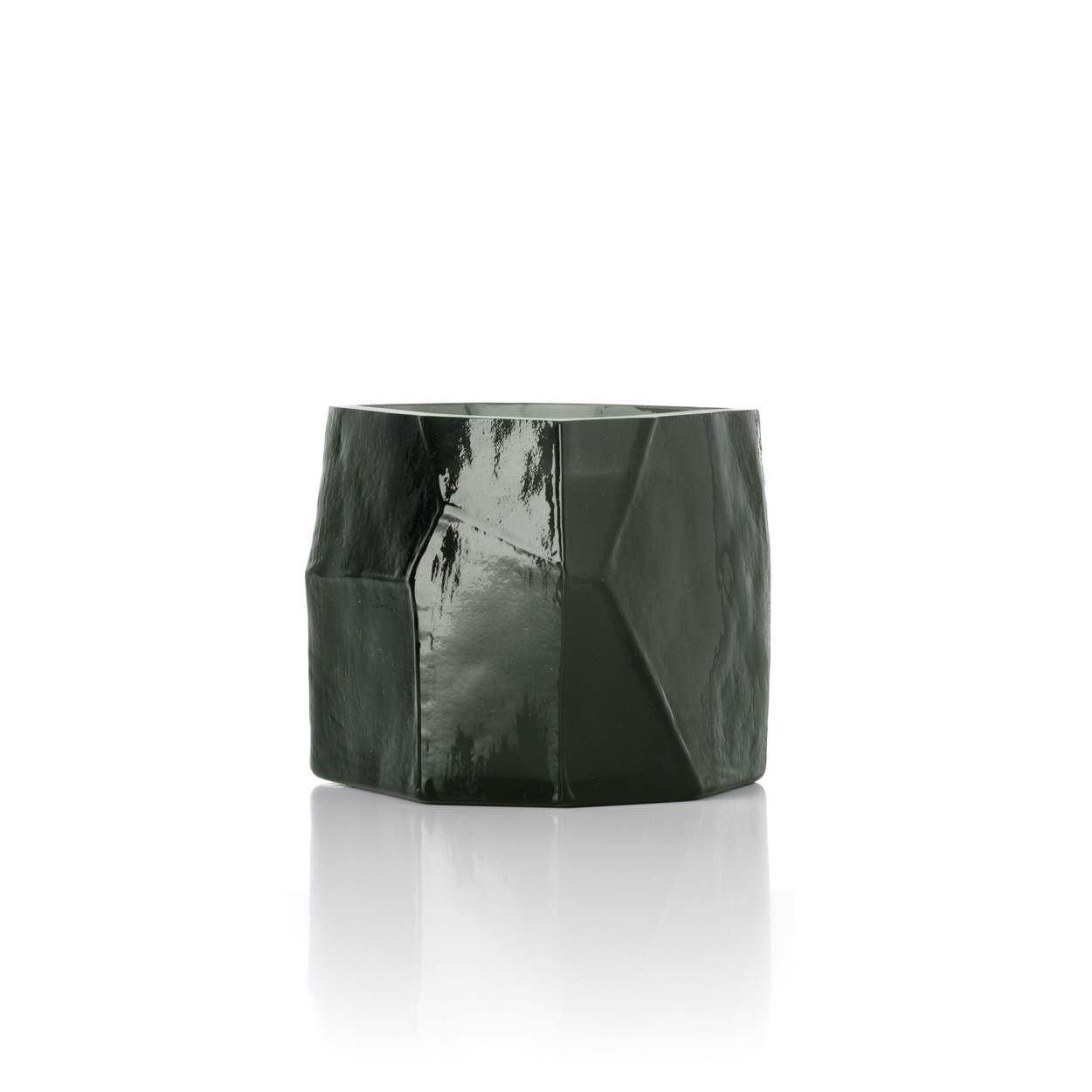 Das Olivine Kerzenglas verkörpert den raffinierten Kontrast zwischen dem soliden Gewicht des Glases und der fließenden Reflexion des Lichts. Dieses Rauchglas verleiht jedem Raum mit seiner markanten, facettierten Form und stillen Eleganz Halt.