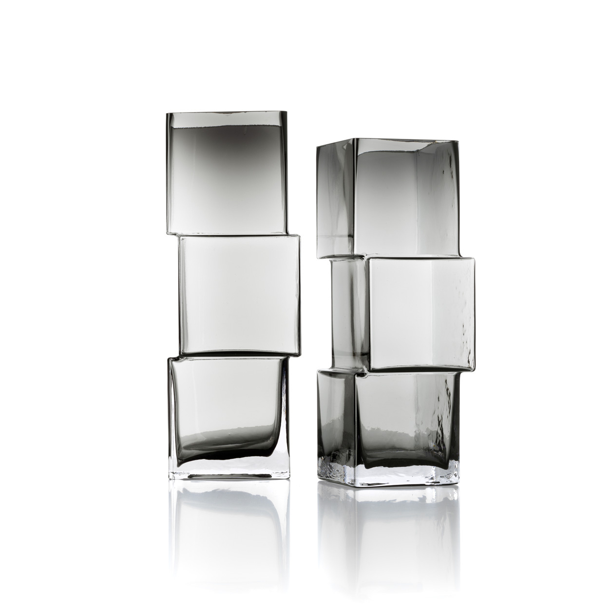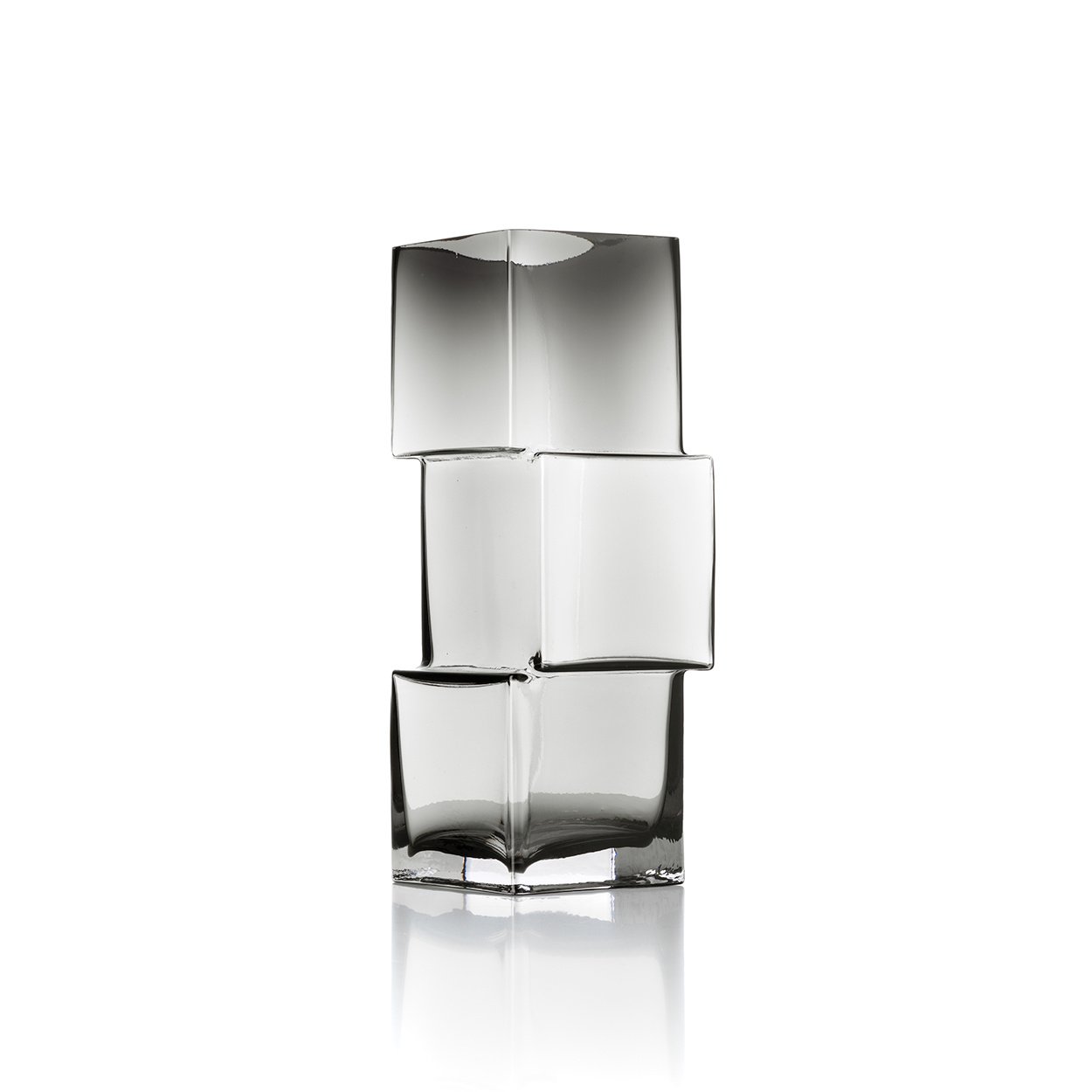 Die Rummikub Vase mit ihrer gestapelten Kubensilhouette verwandelt recyceltes Glas in ein skulpturales Statement. Diese große dekorative Glasvase verbindet architektonische Form mit rauchigem Dunkelgrau und ist ebenso Kunstwerk wie funktionales Gefäß.