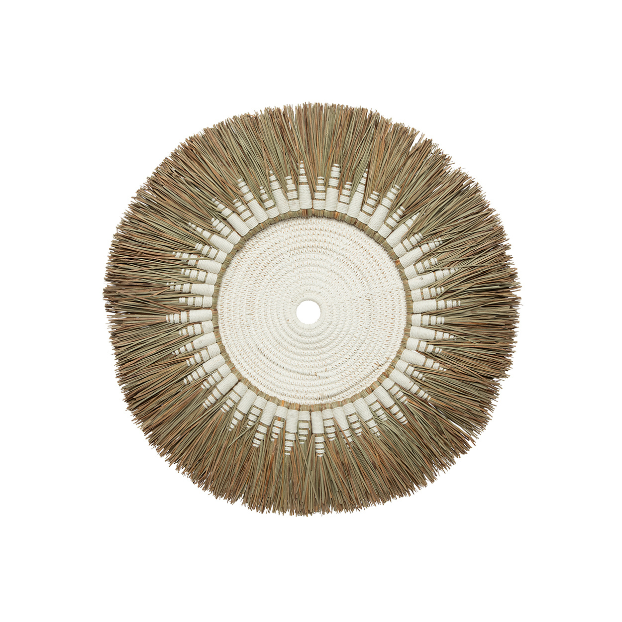 This beautiful wall deco piece has been handcrafted with white cotton macrame and raffia. Its natural appeal and peaceful colour combination make the perfect mix of bohemian meets coastal. It will serve as a great eye-catcher on any blank wall in your home interior.