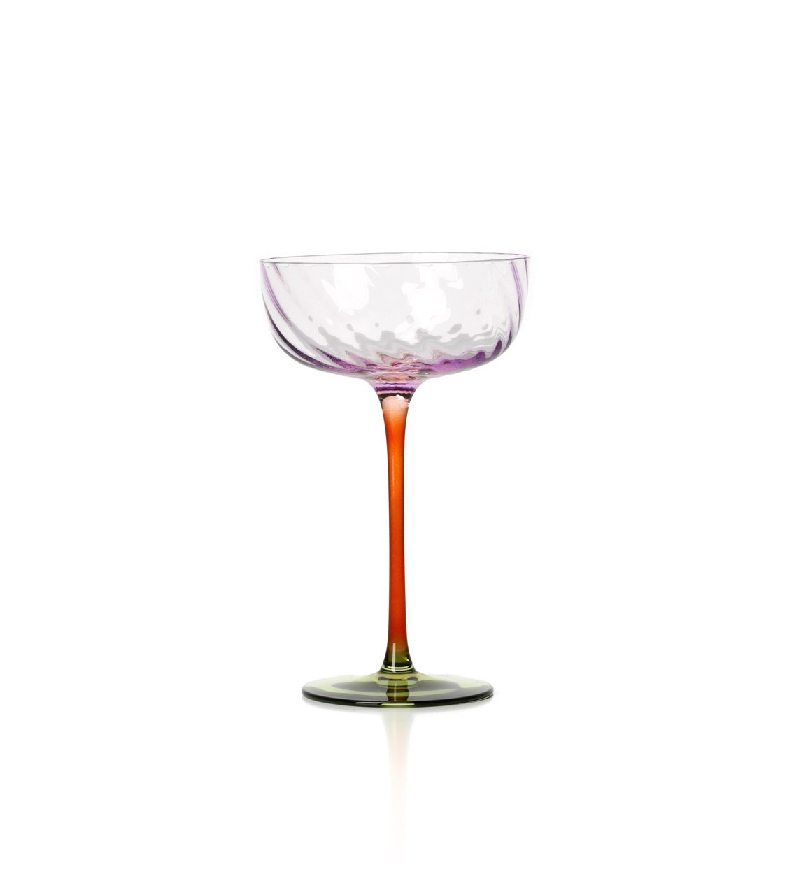 Elegant yet quietly playful, The Trio-Tone Coupe redefines the classic champagne coupe glass with a contemporary edge. Its long, slender stem flows from amber to green, while the bowl shimmers in a soft violet hue, creating a composition that feels both modern and timeless.