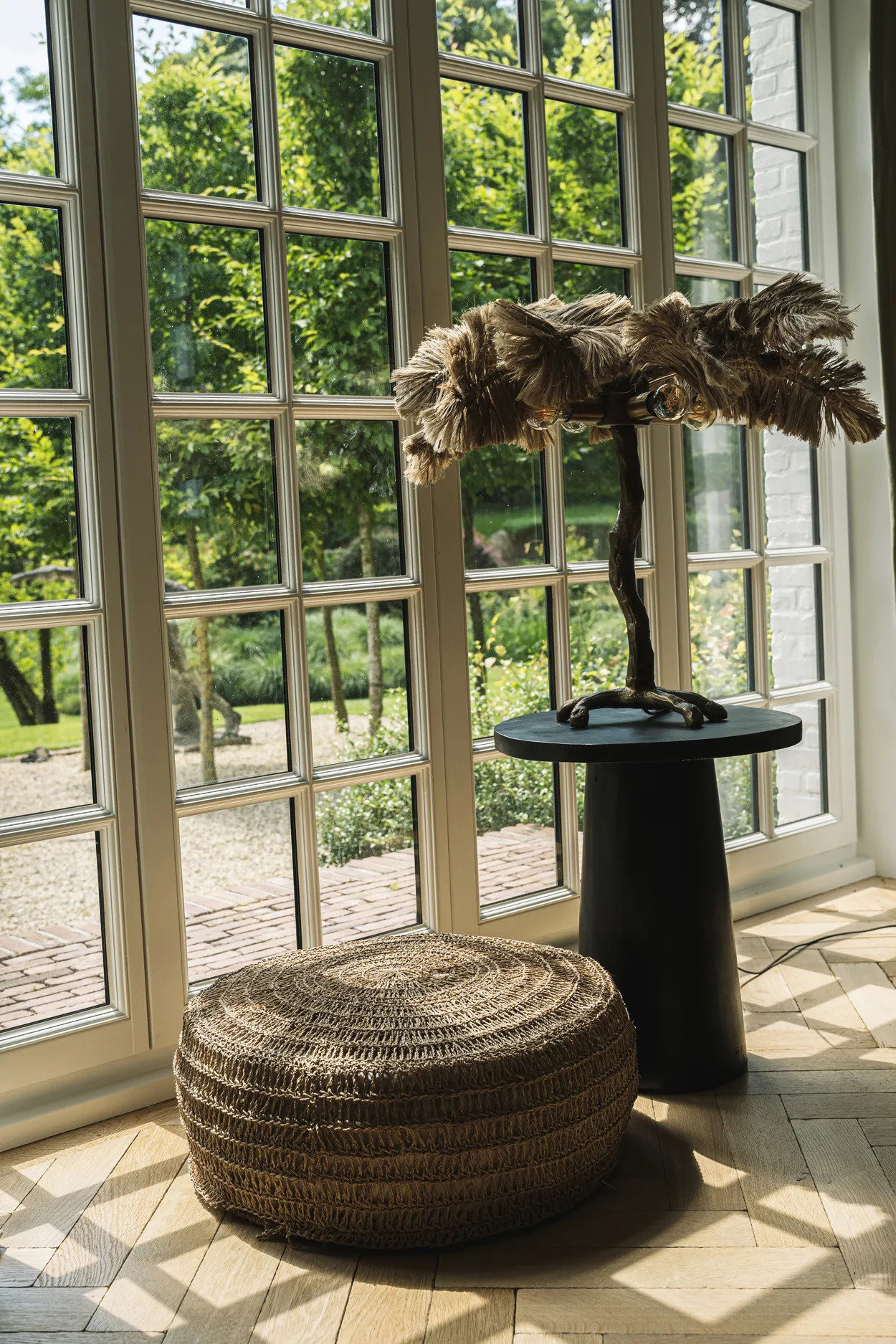Ideal junto a un sillón o como soporte decorativo, ofrece funcionalidad y presencia. Hecha a mano en madera de suar, su textura resalta la belleza natural del material.