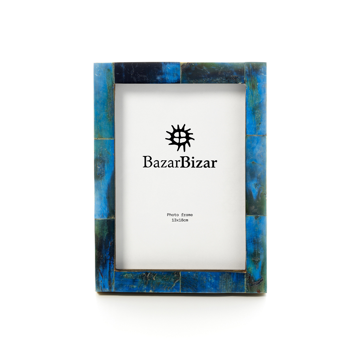 Su formato es ideal para retratos más grandes o momentos especiales, y se integra con facilidad en estanterías, escritorios o consolas. La paleta turquesa aporta frescura a interiores neutros y crea contraste en espacios más eclécticos, mientras que el patrón patchwork añade un aire contemporáneo. Fabricado en hueso de búfalo, combina resistencia y elegancia con una superficie suave muy apreciada en la artesanía.