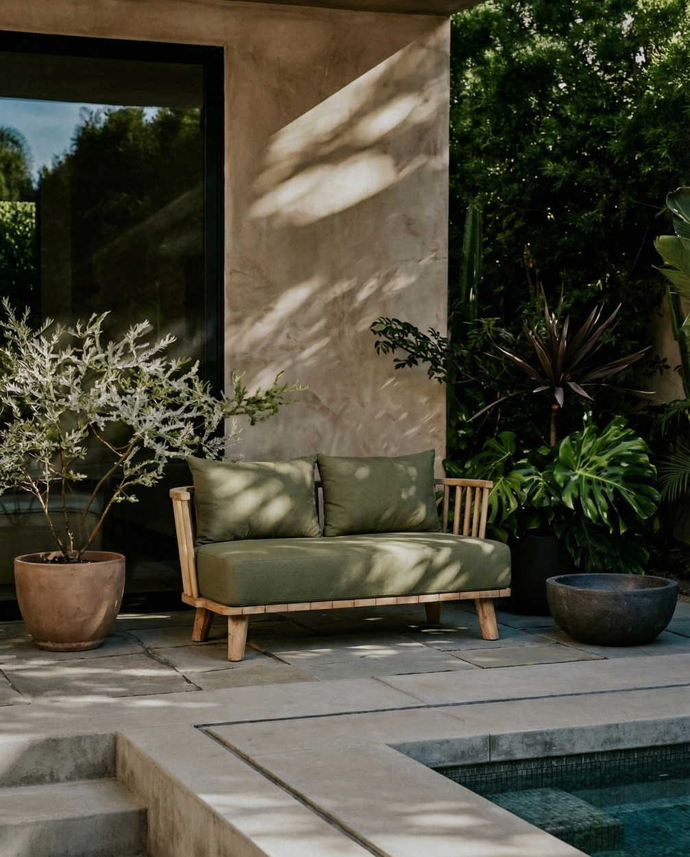 Diseñado para el uso exterior diario, el sofá funciona como un asiento cómodo para compartir sin formalidad. Los cojines están rellenos de espuma de secado rápido y envueltos en tejido exterior, permitiendo que se sequen con rapidez y mantengan soporte tras el sol o la lluvia ligera. Las proporciones fomentan comodidad sin dominar el espacio.