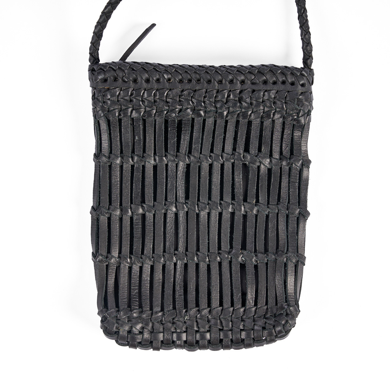 Su perfil estilizado mantiene los objetos esenciales al alcance mientras deja las manos libres, lo que lo hace adecuado para paseos, viajes o trayectos entre destinos. La superficie de cuero trenzado aporta una textura sutil sin peso visual y permite que el material se suavice con el uso.