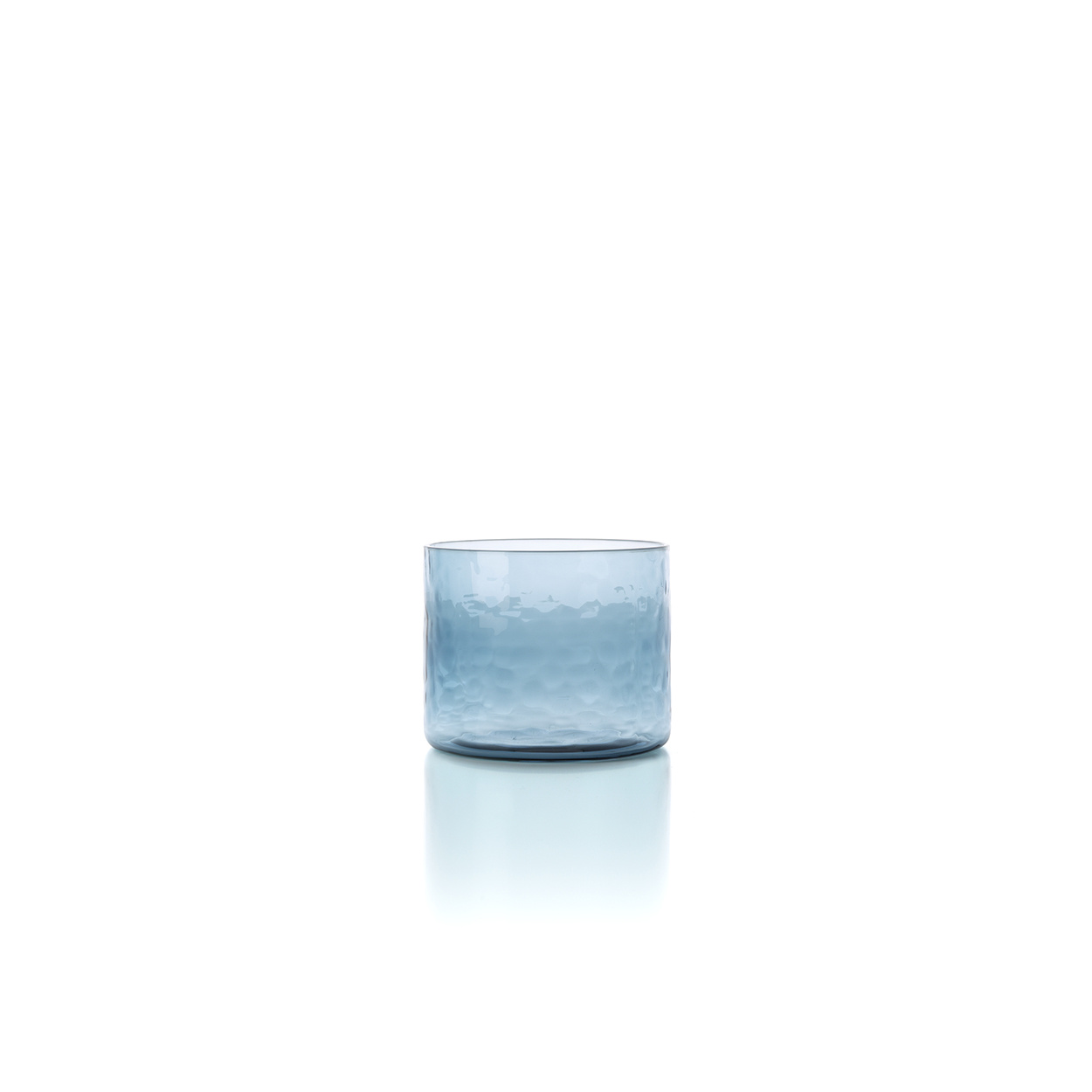 Bicchiere da bere blu artigianale con texture martellata e profilo basso, ideale per acqua, whisky o cocktail con stile elegante.