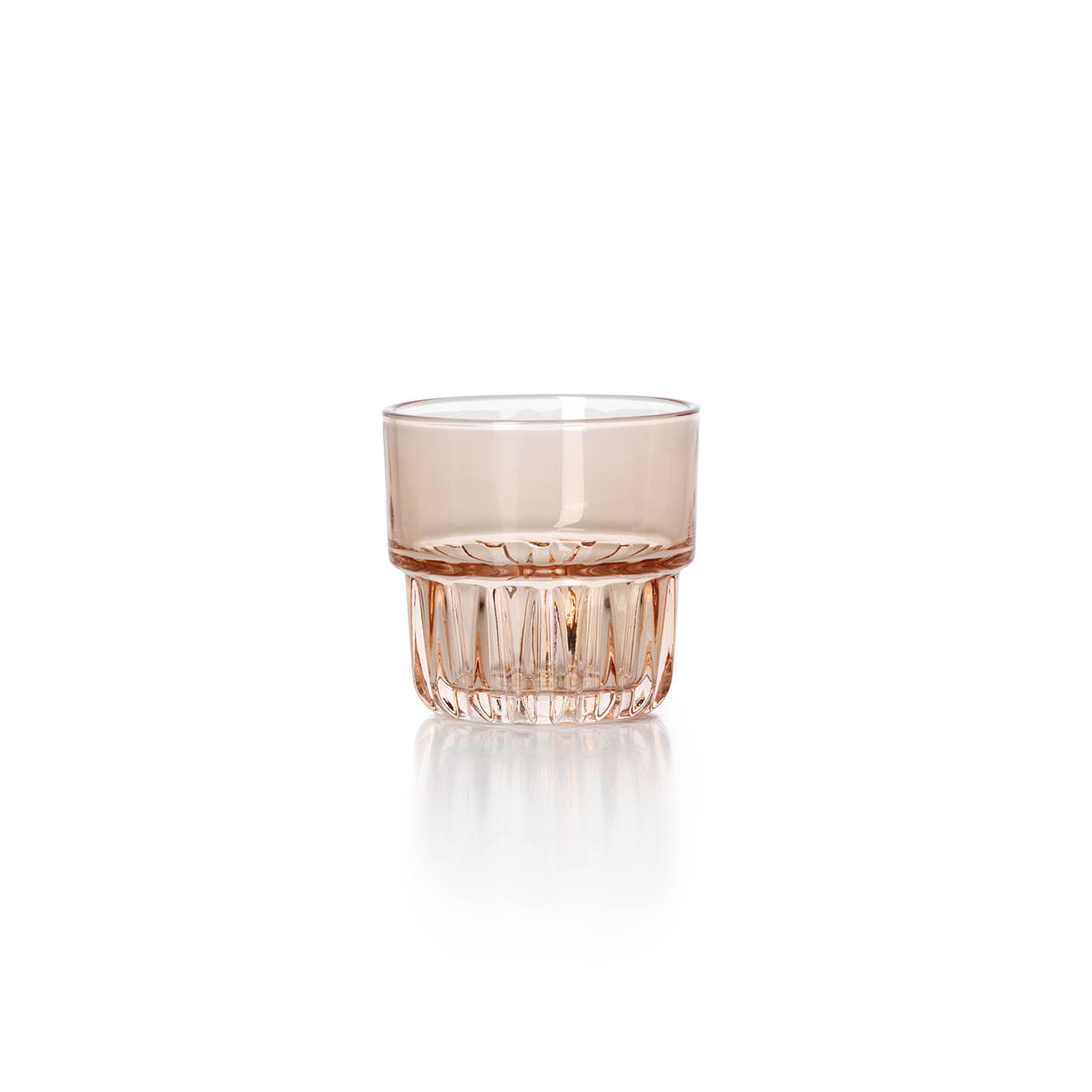 • Elegante bicchiere in vetro rosa blush con base sfaccettata, realizzato a mano in vetro riciclato e disponibile in altri colori per tavole moderne e raffinate.