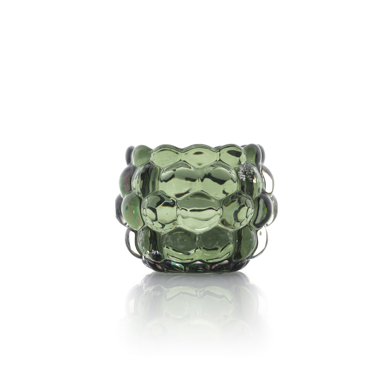 • Groene glazen kaarshouder met sculpturaal bubbeldesign, handgemaakt van gerecycled glas voor zachte reflecties en sfeervolle gloed.