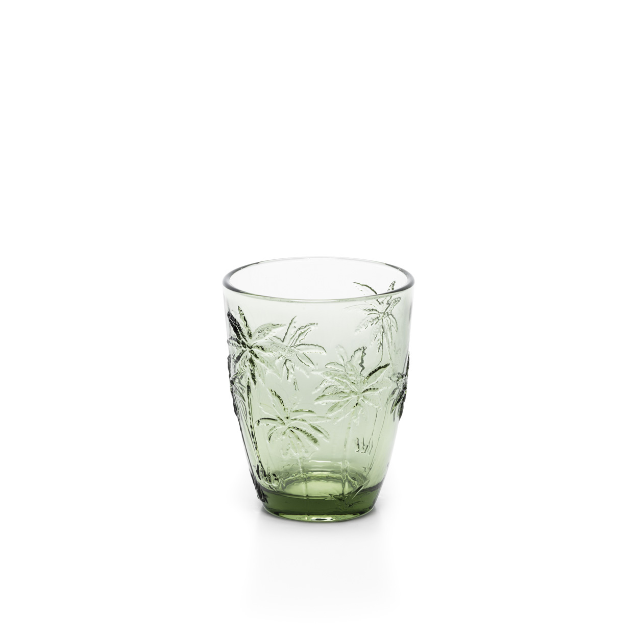 Zonovergoten maaltijden krijgen een ontspannen elegantie met Het Palm Breeze Waterglas in groen. Dit matte waterglas, gedetailleerd met gegraveerde palmbomen, vangt het licht op speelse manieren en brengt zowel textuur als tropische charme naar je tafel.